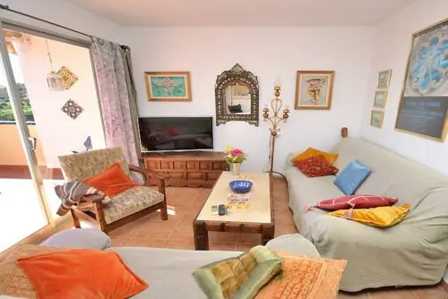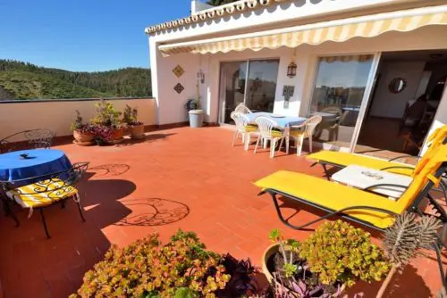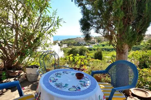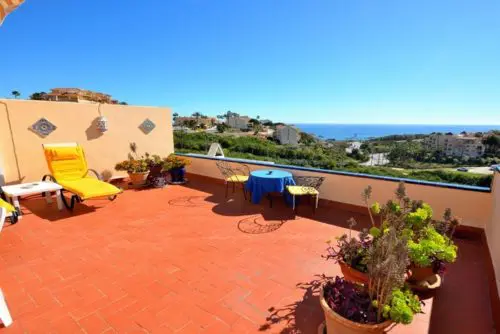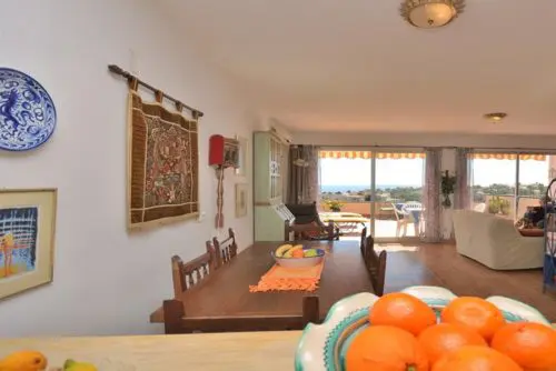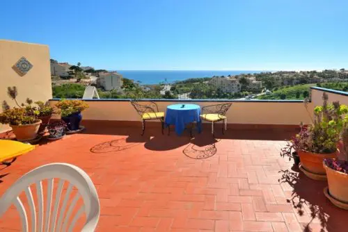 Hyggelig ferielejlighed med 40 m² sydvendt terrasse og åben hav- og naturudsigt til salg, placeret kun 700 m. fra stranden og 800 m. fra promenaden i Fuengirola.