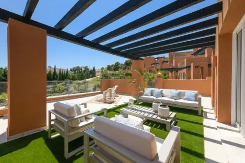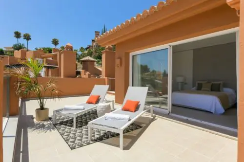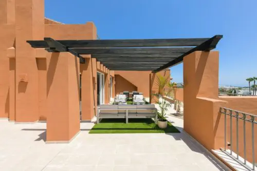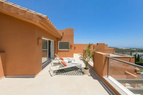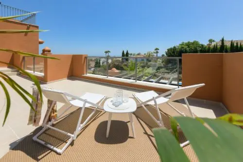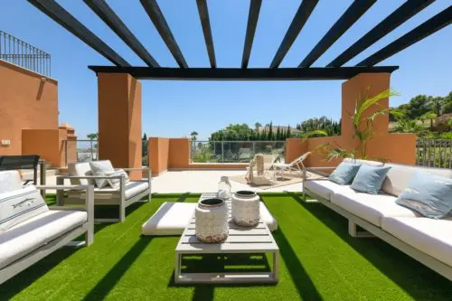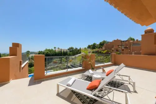 Eksklusiv duplex penthouse til salg nær Puerto Banus i Marbella, med 3 soveværelser, 3 badeværesler og et fantastisk opholdsmiljø med udgang til overdådige terrassearealer.