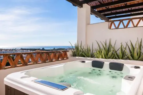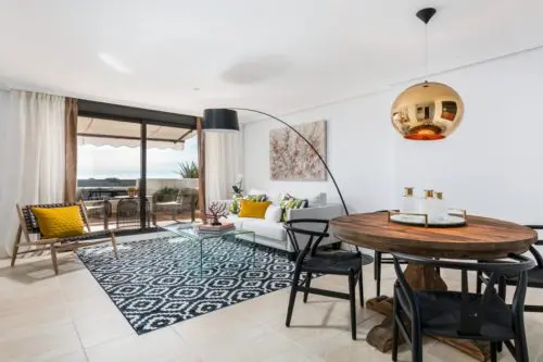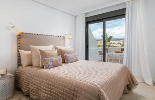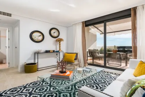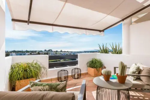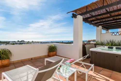 Elegant penthouse med stor sydvendt terrasse til salg i La Resina, få minutters kørsel fra både Puerto Banus samt Estepona, og i kort afstand til golf, by og vand.