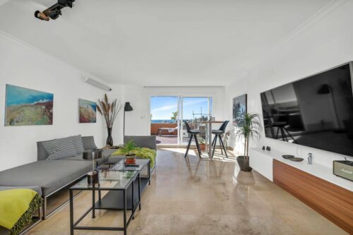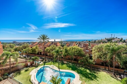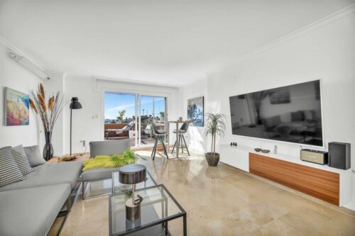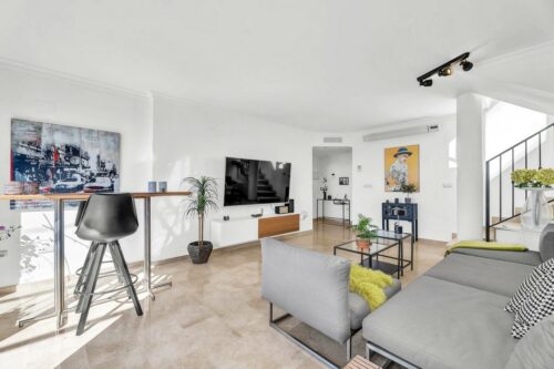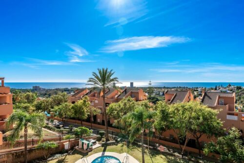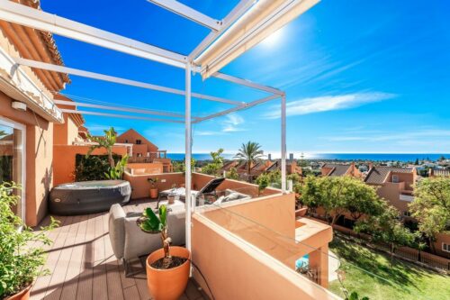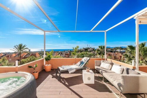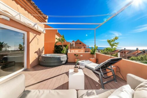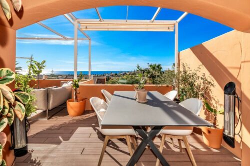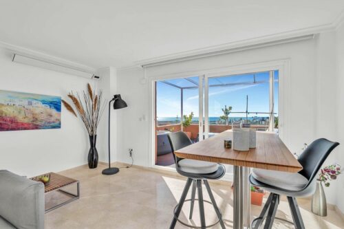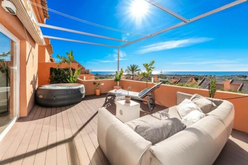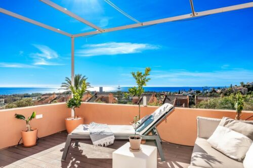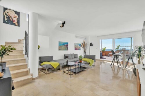 Uhørt lav pris: Fantastisk penthouse lejlighed til salg i Marbella, med et smagfuldt og moderne interiør, en skøn sydvestvendt solterrasse og uforsyrret panoramaudsigt til vandet.