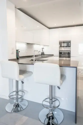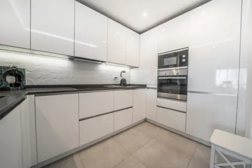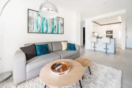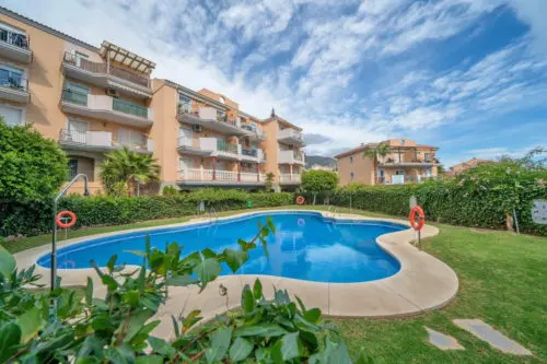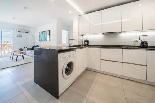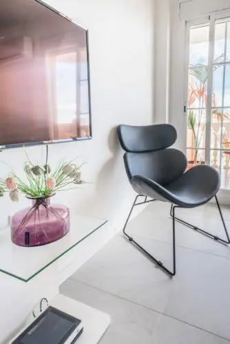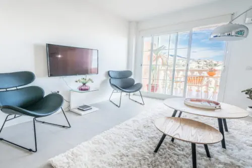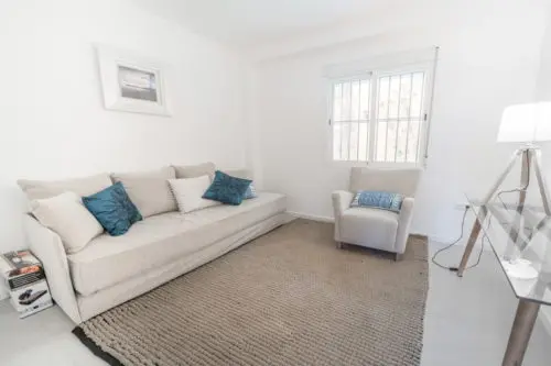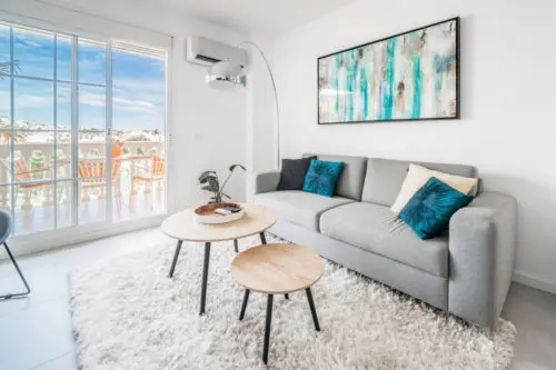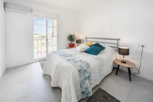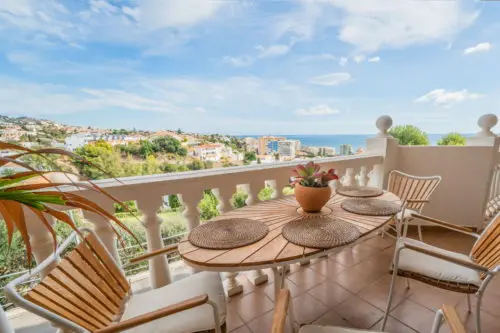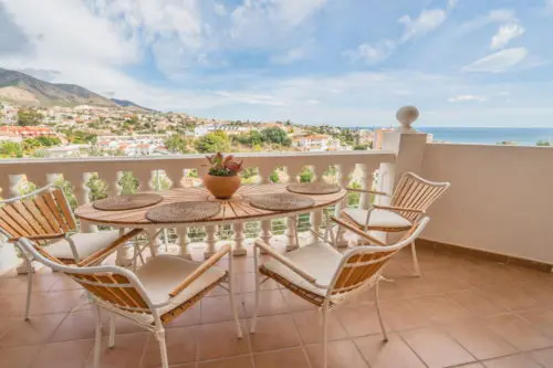 Nyrenoveret ferielejlighed med 2 soveværelser og flot by-, bjerg- og Middelhavsudsigt til salg i Fuengirola, beliggende under 1 km. fra strand, tog, indkøb og restauranter.