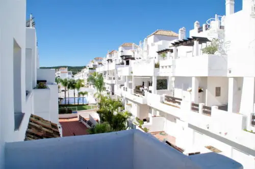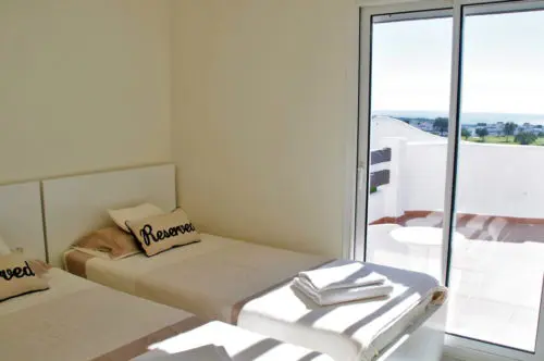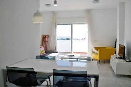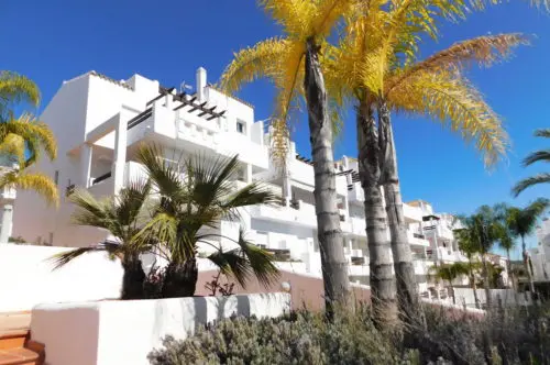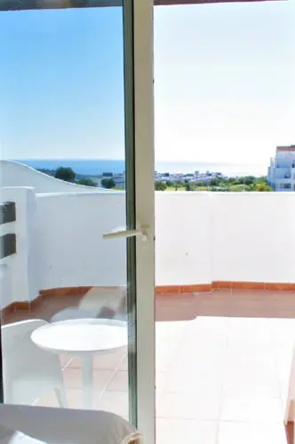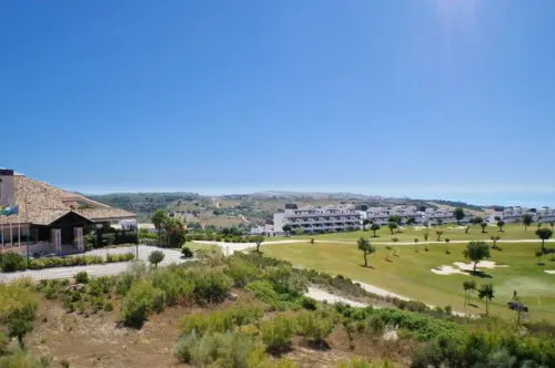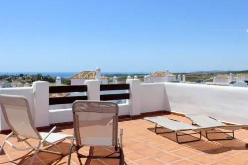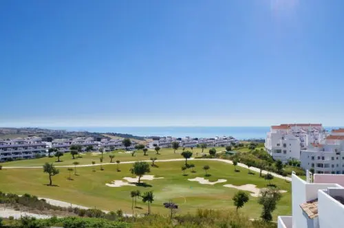 Golf penthouse til salg i Estepona, med stor tagterrasse og smuk åben udsigt henover grønne baner og videre udover Middelhavet. Kort afstand til Estepona centrum.