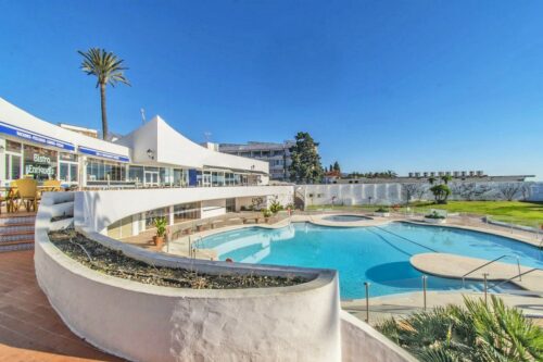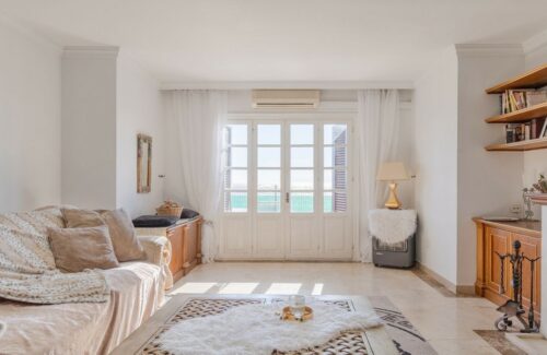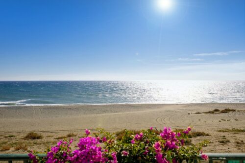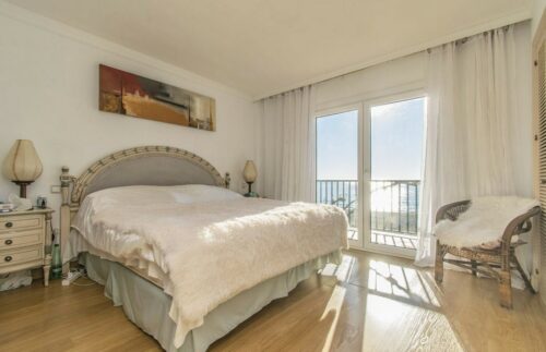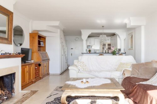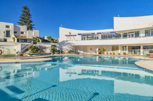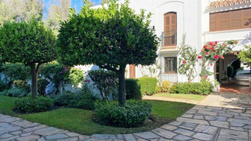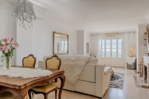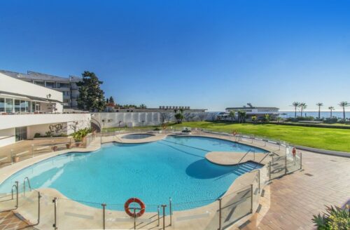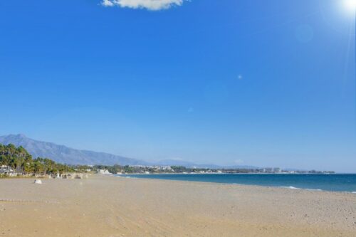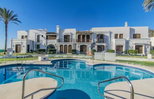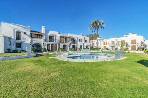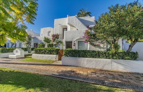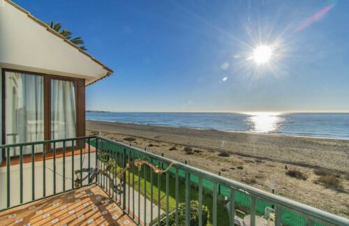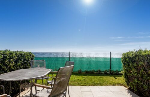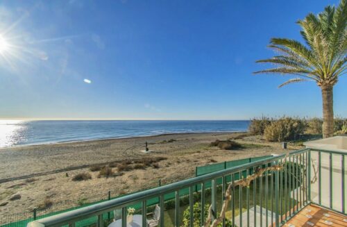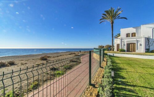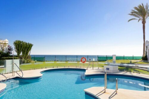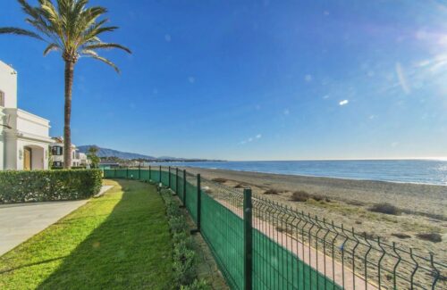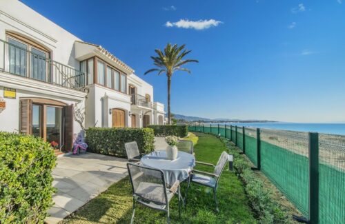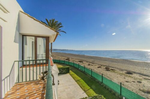 Charmerende hus til salg i første række til vandet i Estepona, med tre soveværelser, uforstyrret middelhavsudsigt og adgang til fantastiske fællesfaciliteter inkl. hele fire pools.