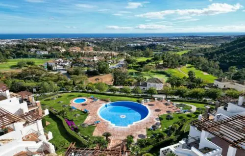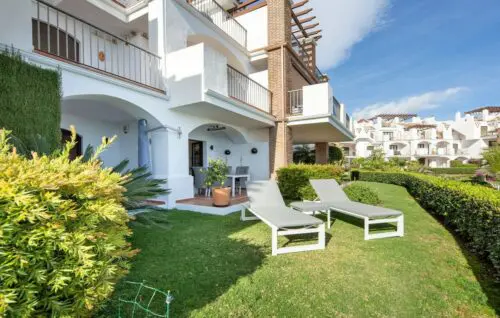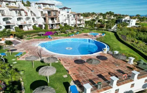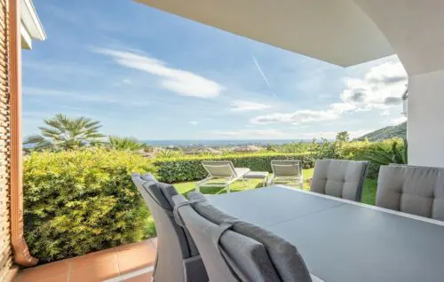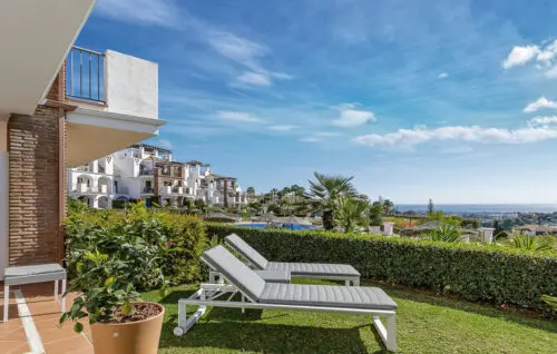 Skøn lejlighed med åbent middelhavsvue, solrig sydvendt terrasse og to gode soveværelser, til salg i det eftertragtede Los Arqueros, få minutters kørsel fra Mabella's mange tilbud.