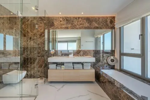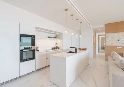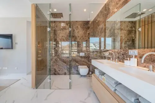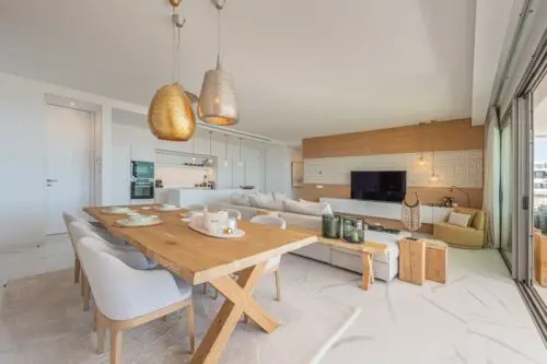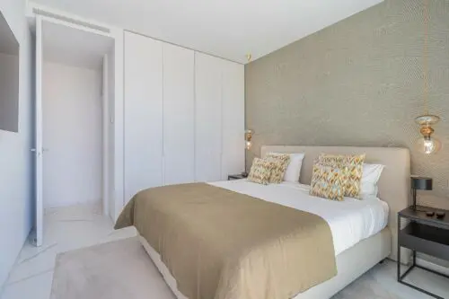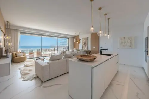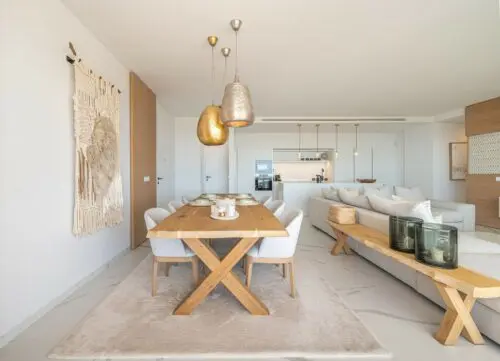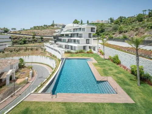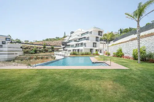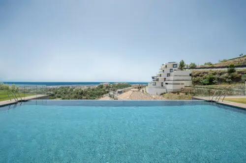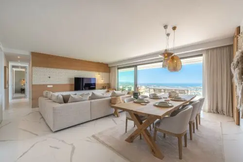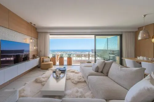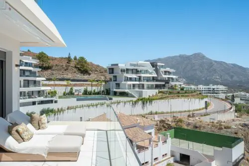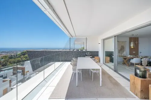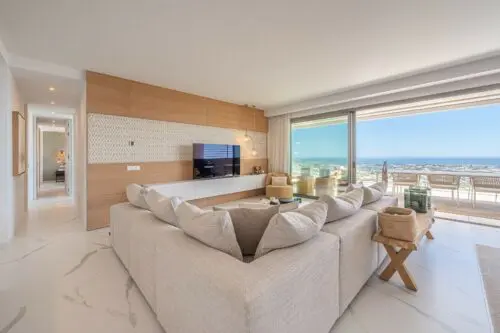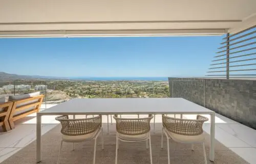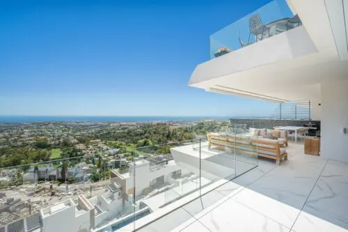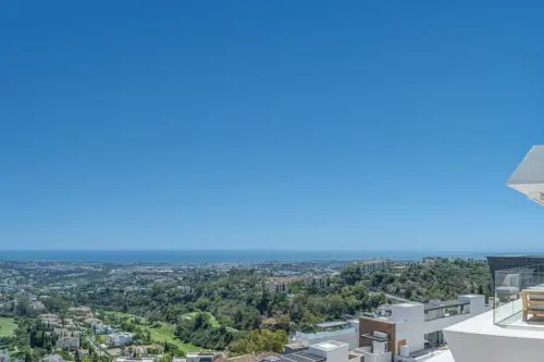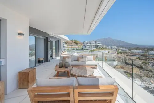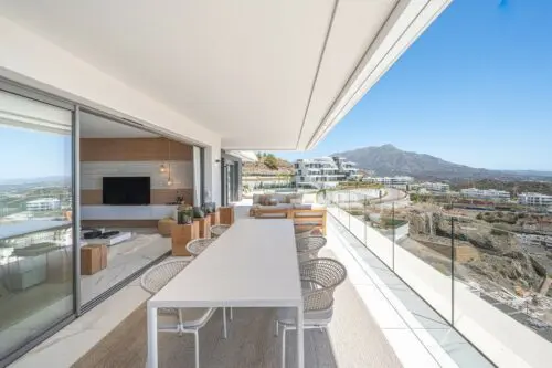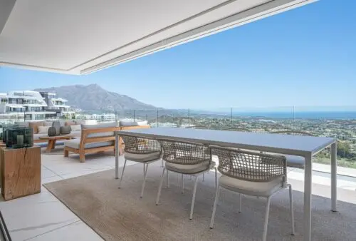 Luksuriøs nybygget lejlighed til salg i Benahavis, med tre store soveværelser og 61 m²sydvendt terrasse, hvorfra et fænomenalt panoramavue til Middelhavet og bjerge udfolder sig.