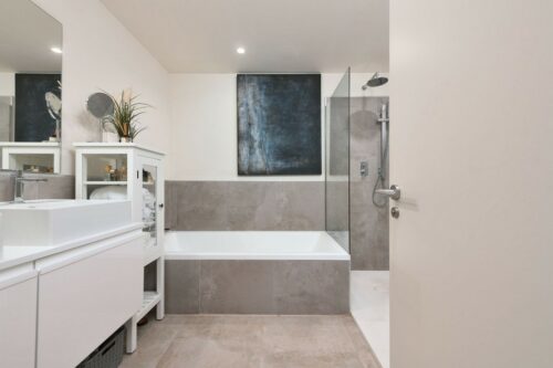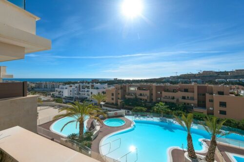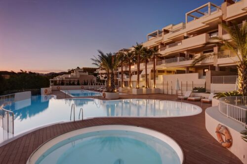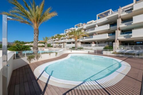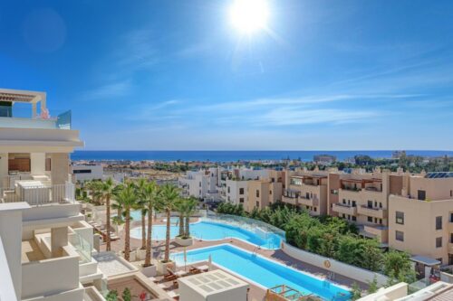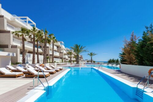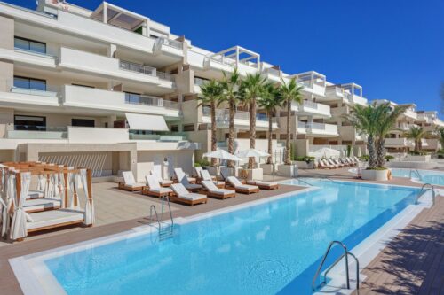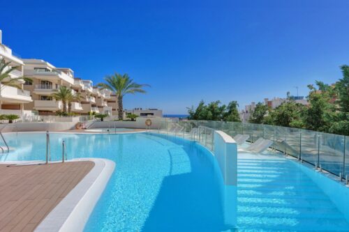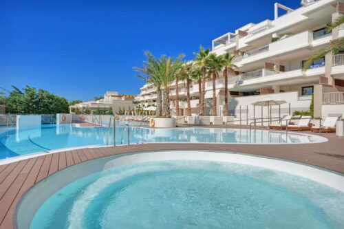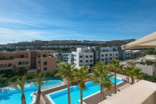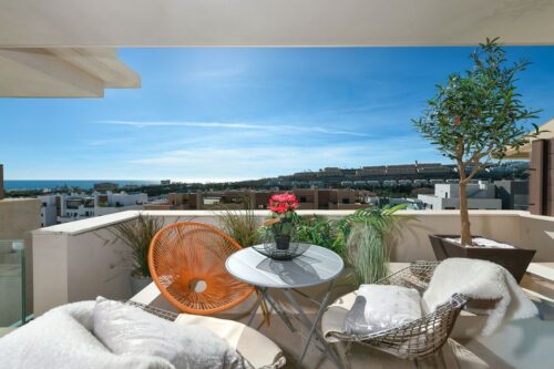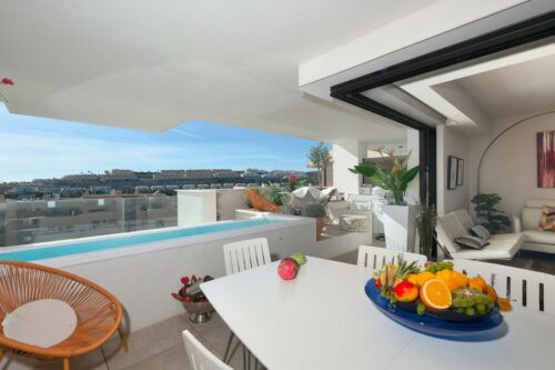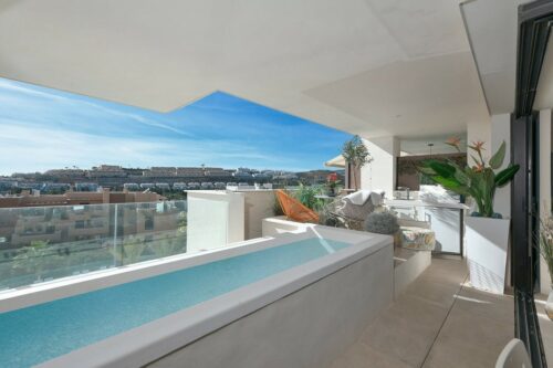 Luksuriøs moderne lejlighed til salg i La Cala de Mijas, med tre soveværelser, privat pool, skøn middelhavsudsigt og placering få minutters gang fra både byens centrum og strand.