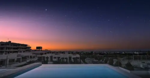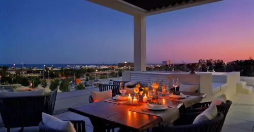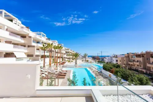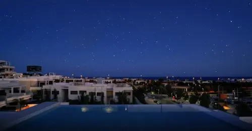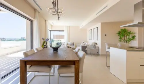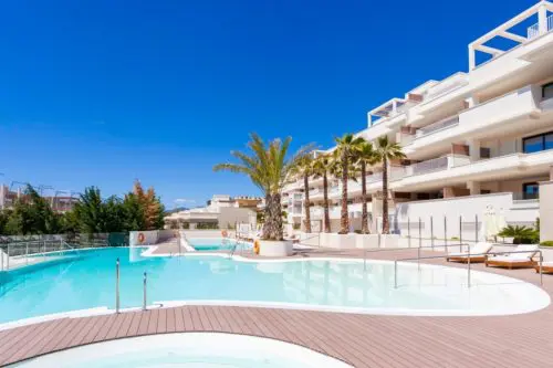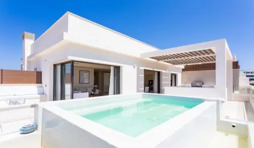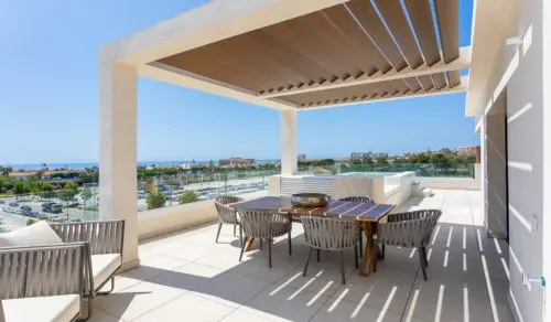 Sjældent udbudt luksus-penthouse med fire soverum, havudsigt og egen pool til salg. Super attraktiv beliggenhed, bare fem minutters gang fra det hyggelige La Cala de Mijas centrum.