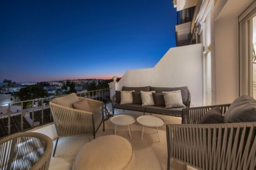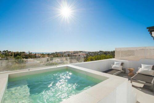 Nyrenoveret luksuspenthouse med privat pool til salg i hjertet af Nueva Andalucia, få minutters gang fra velrenomerede restauranter, gode indkøbsmuligheder og velkendte golfbaner.