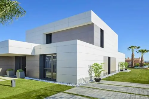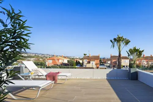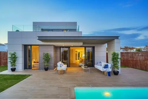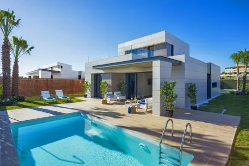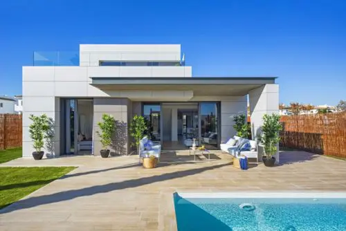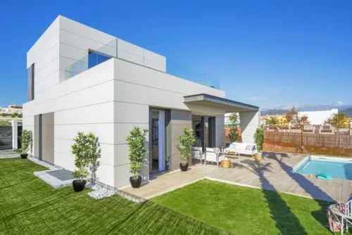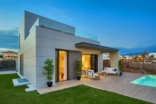 Nordisk perle under den spanske sol: Helt nye, minimalistiske design-villaer, med egen pool, fuldt etableret have og 3 soveværelser til salg, blot 500 meter fra strand og by.