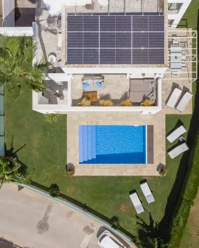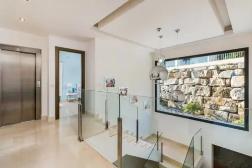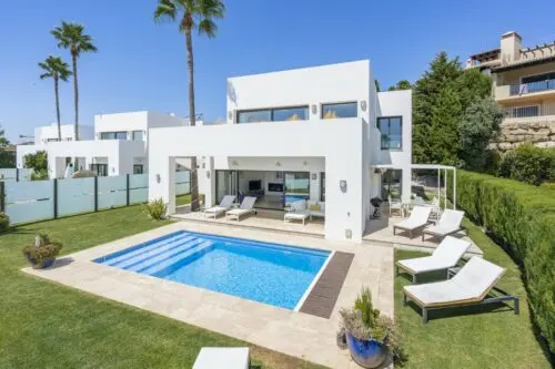 Arkitekttegnet funkisvilla med fem soveværelser, privat pool og panoramisk Middelhavsudsigt, placeret på en super attraktiv adresse et stenkast fra Puerto Banus i Marbella.
