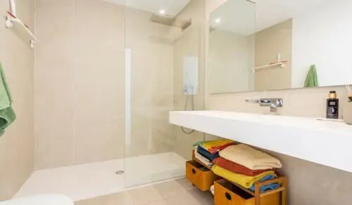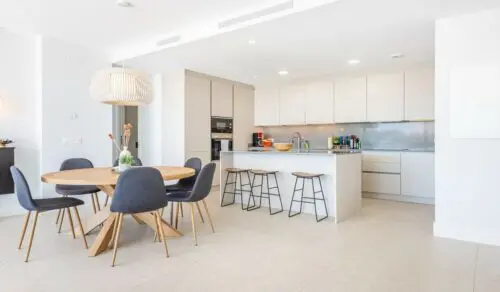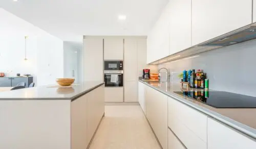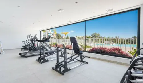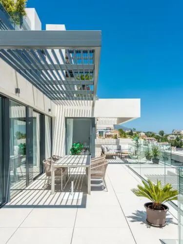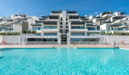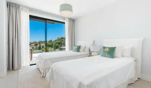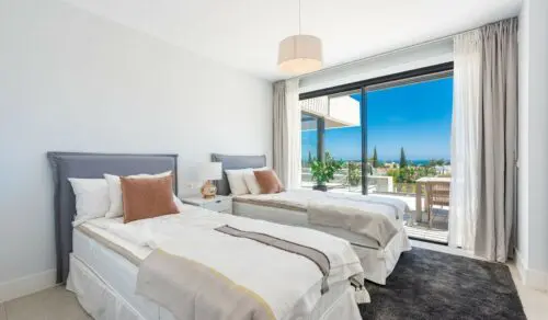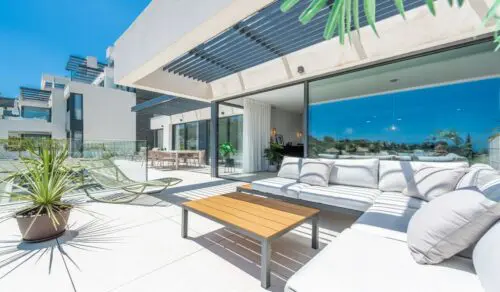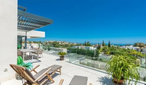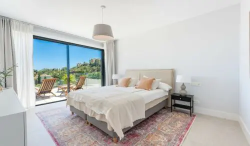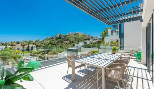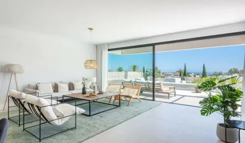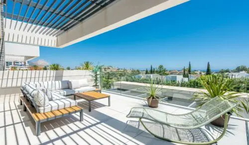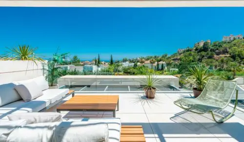 Luksuriøs lejlighed i moderne stil med tre soveværelser, stor sydvendt terrasse og smuk åben udsigt, til salg på rolig adresse i Benahavis, få minutters kørsel fra Puerto Banus.