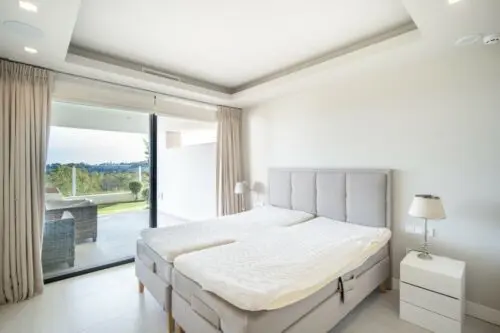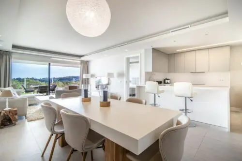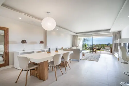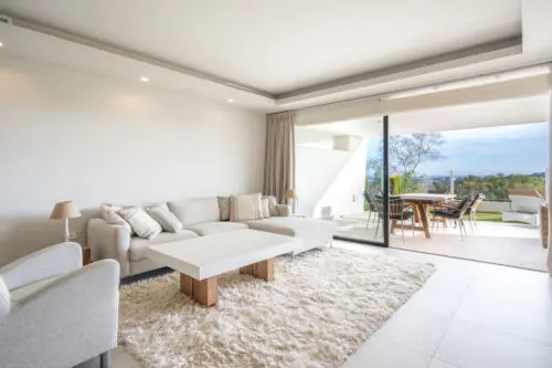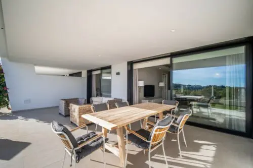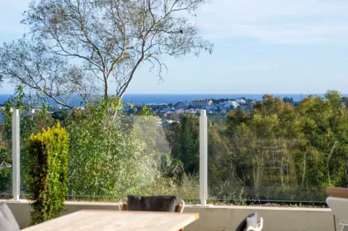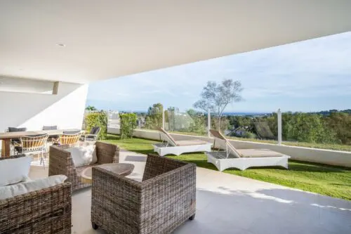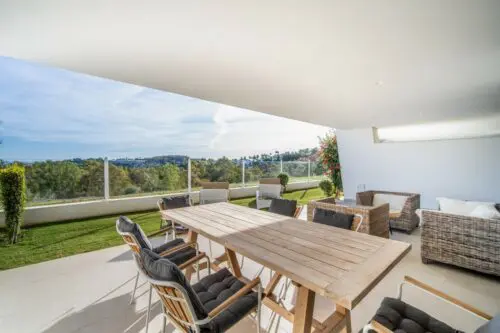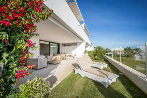 Moderne luksuslejlighed til salg i Marbella's eksklusive nabolag Nueva Andalucia, med to soveværelser, stor sydvendt terrasse, egen have og panoramisk udsigt til golf og vand.