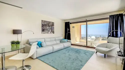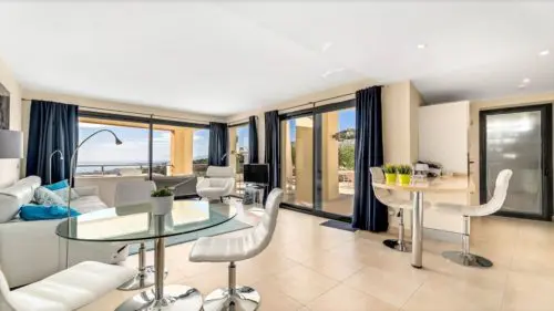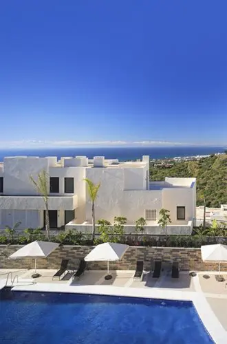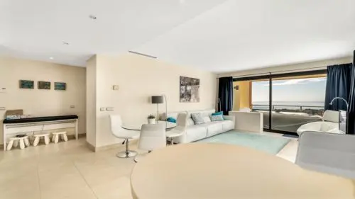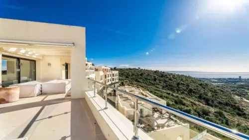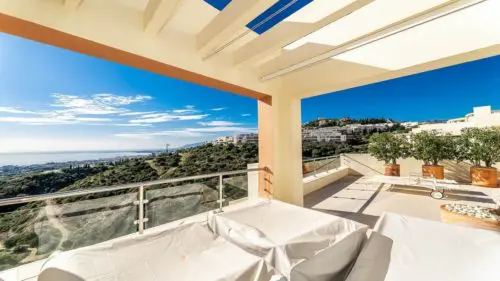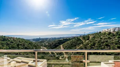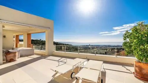 Stilren og moderne panorama-penthouse til salg i Marbella. Her venter jer en enorm privat solterrasse, en uovertruffen hav- og naturudsigt, samt fællesfaciliteter i verdensklasse.