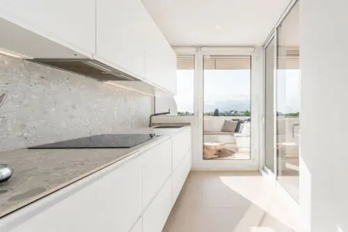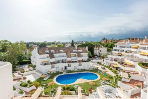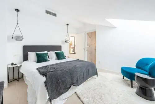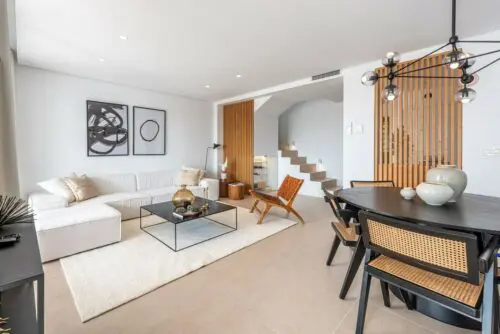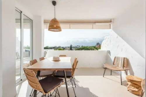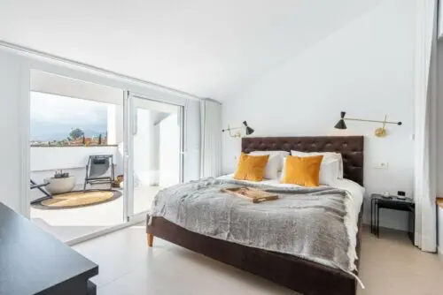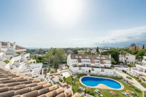 Luksuriøs duplex penthouse til salg på yderst attraktiv adresse i hjertet af skønne Nueva Andalucia, placeret under 15 minutters gang fra supermarked, restauranter og Puerto Banus.