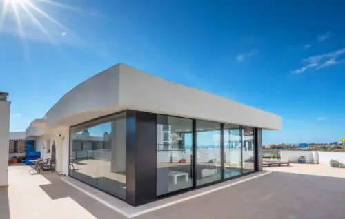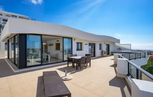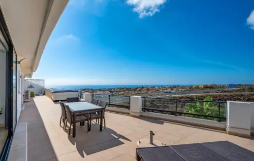 Moderne penthouse til salg i Mijas Costa, med en kæmpemæssig privat terrasse på hele 132 m², og et spektakulært panoramavue til byens tage og videre udover Middelhavet.