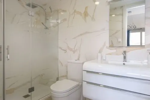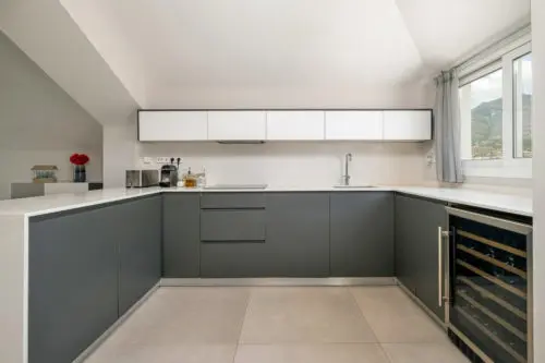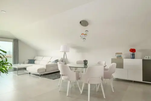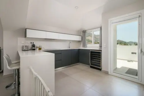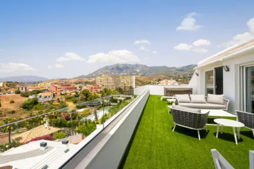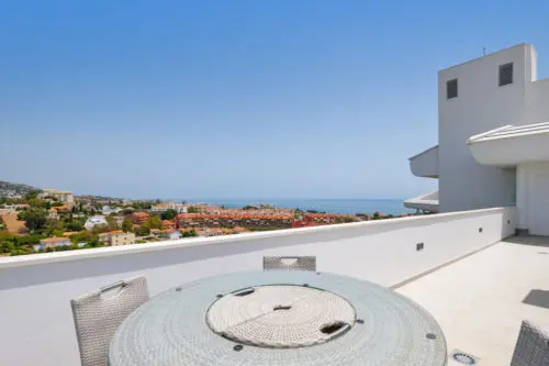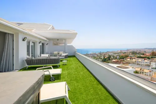 Moderne penthouse til salg i Torreblanca nær promenaden og Fuengirola centrum, med to store terrasser, panoramisk udsigt og tre rummelige soveværelser.