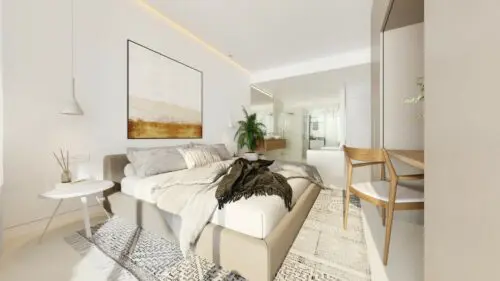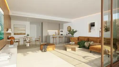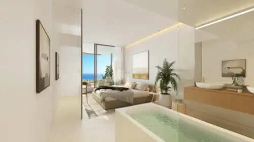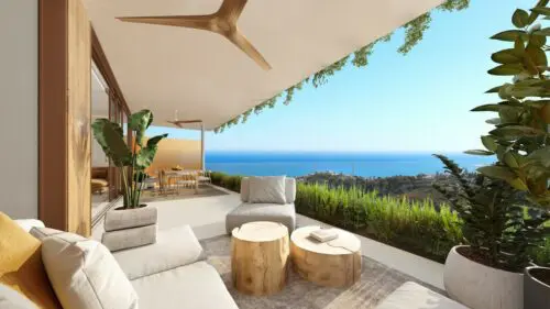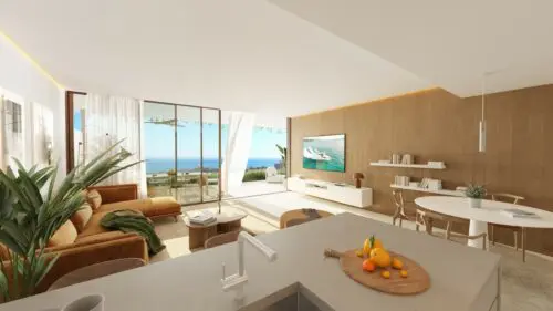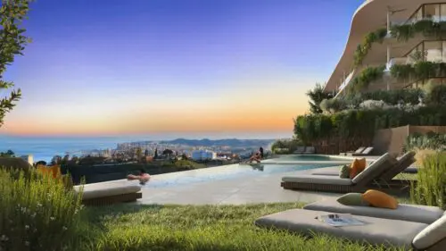 Moderne udsigtslejligheder til salg nær Fuengirola, med enten to eller tre soveværelser, åbne planløsninger og solrige terrasser med flot vue til by, vand og bjerge.