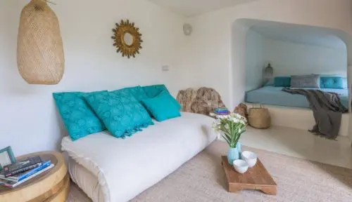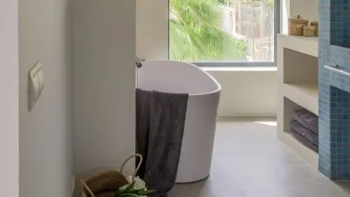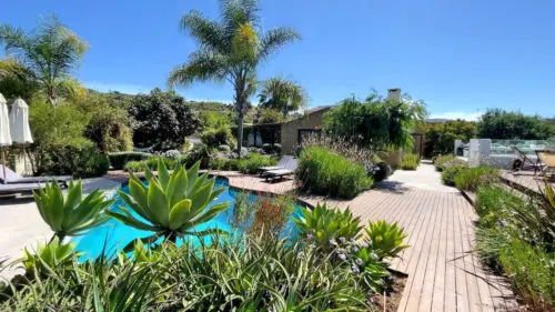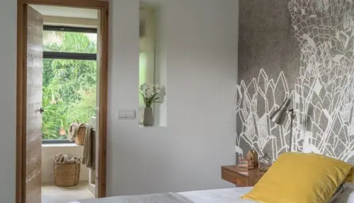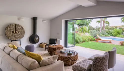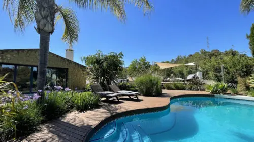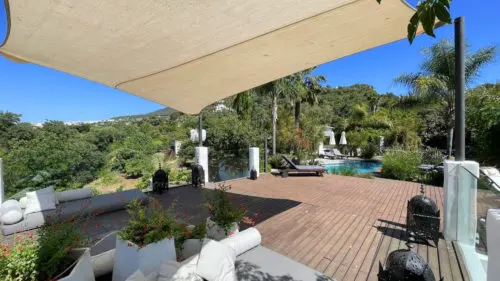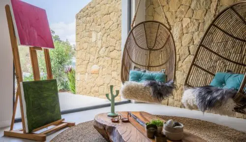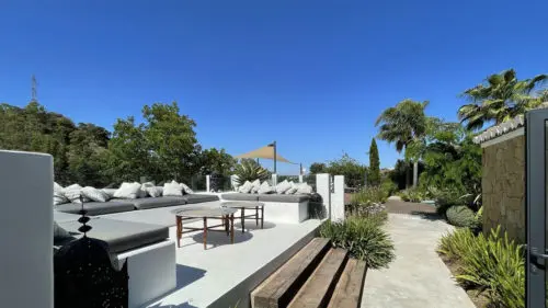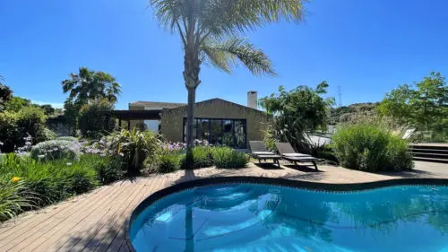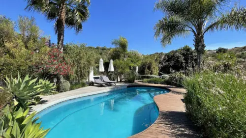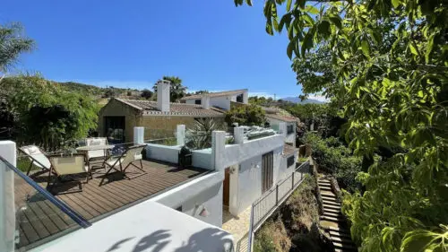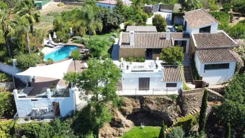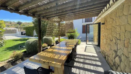 Moderniseret landhus i attraktiv Ibiza-stil til salg på rolig adresse lidt udenfor Malaga, med fem soveværelser, egen swimmingpool og hele 10.000 m² privat grund.