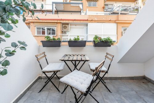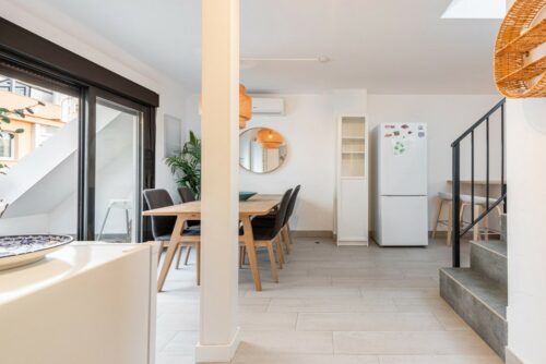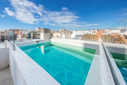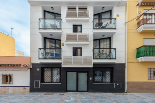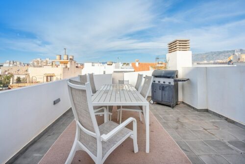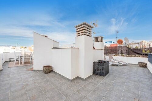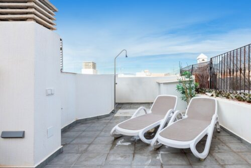 Nybygget penthouse med privat tagterrasse og pool, på fantastisk placering i anden række til Middelhavet i Fuengirola centrum, få skridt fra strandpromenadens mange gode tilbud.