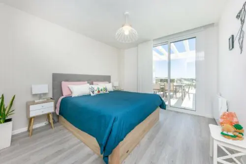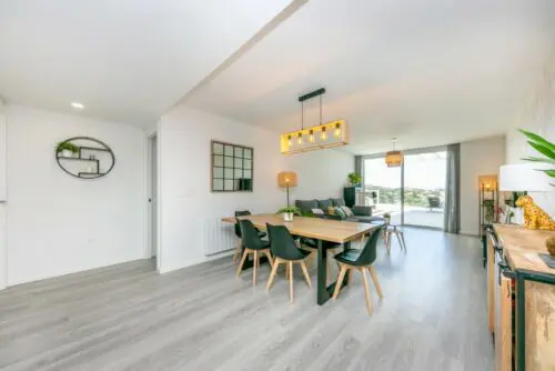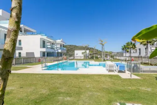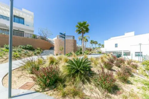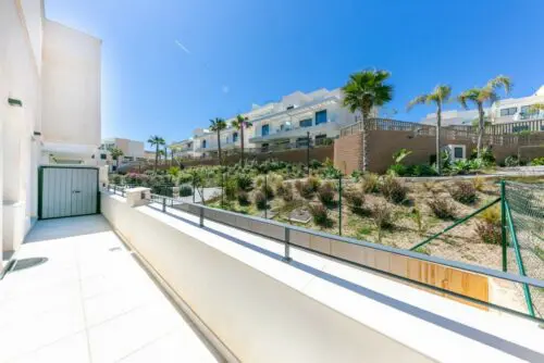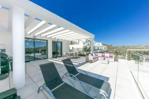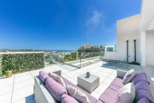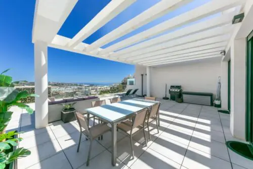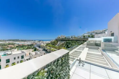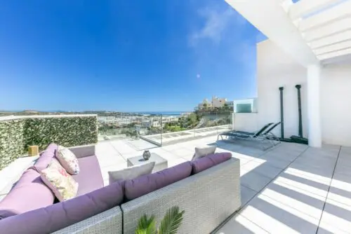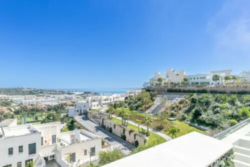 Skøn nyere luksuspenthouse fra 2020 til salg, med tre soveværelser, stor udsigtsterrasse, og en eftertragtet placering i grønne bakker et stenkast fra hyggelige La Cala de Mijas.