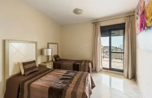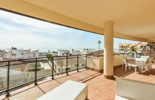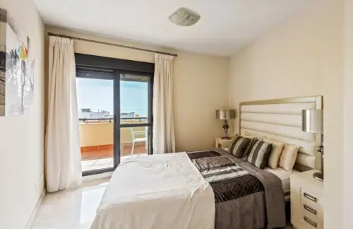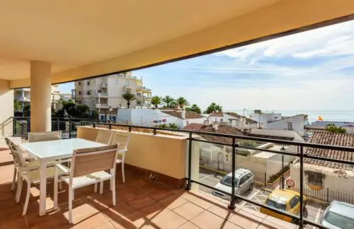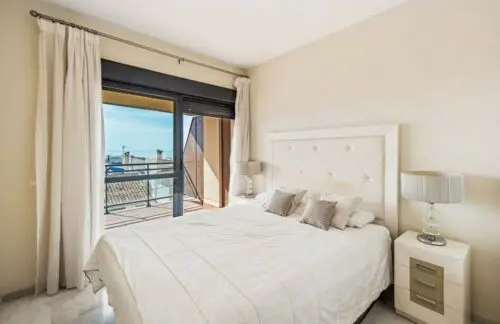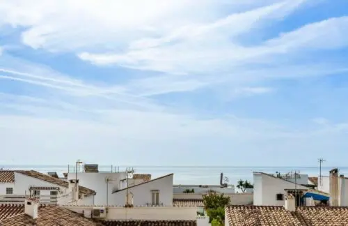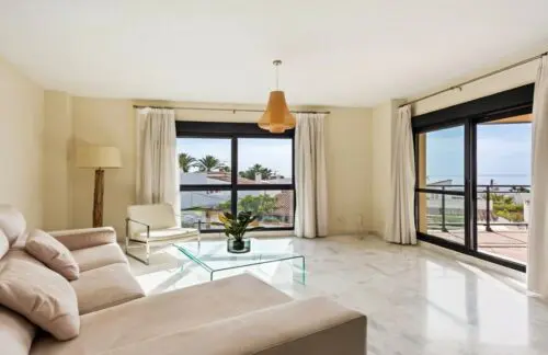 Nyere og sjældent udbudt lejlighed fra 2013 til salg på stranden i Estepona, med tre rummelige soveværelser, stor sydvendt terrasse og åben udsigt udover Middelhavet.