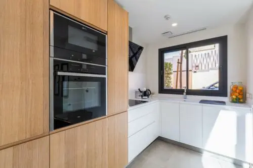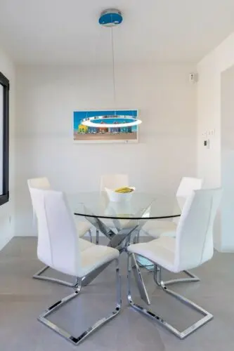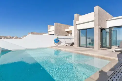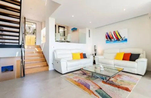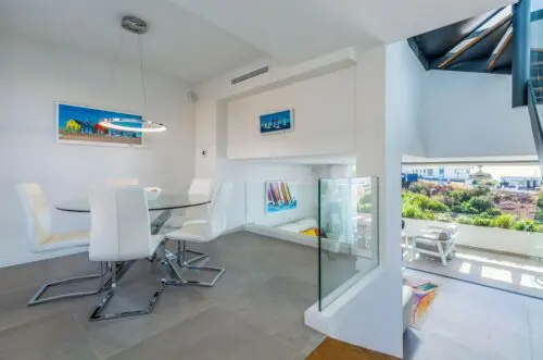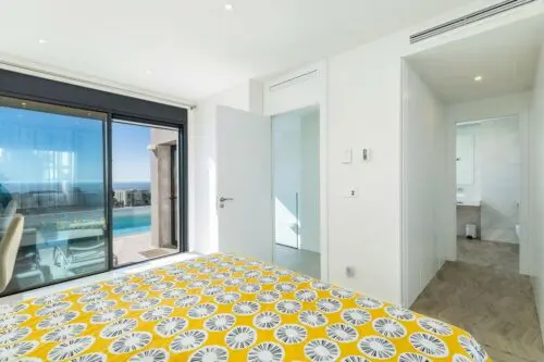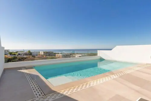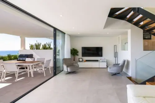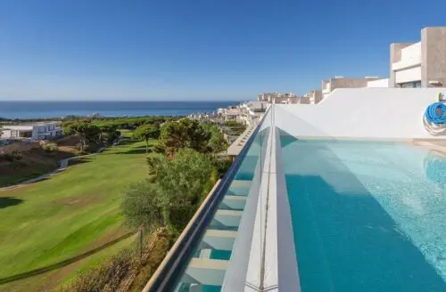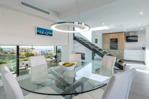 Drømmebolig til salg i Marbella, i form af dette nymoderne hus med egen pool, og panoramavue udover Middelhavet samt Cabopino golf, placeret i gåafstand fra den hyggelige havn.