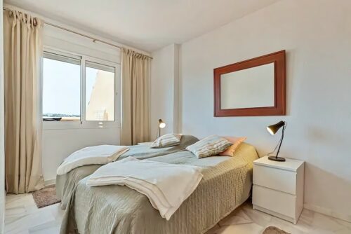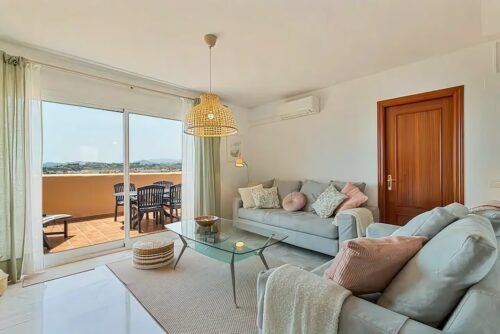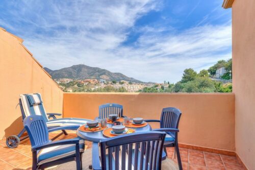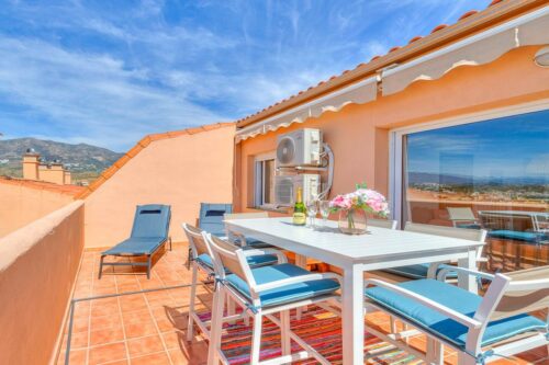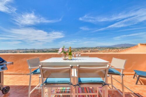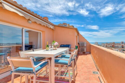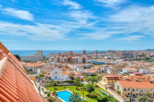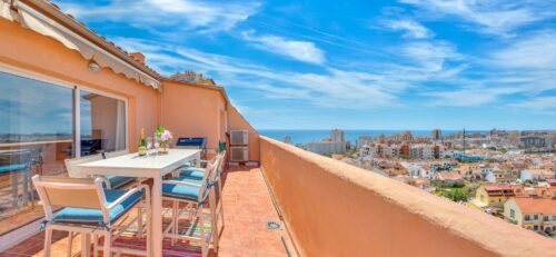 Nyrenoveret penthouse til salg centralt i Fuengirola, med tre gode soveværelser, stor sydvendt solterrasse og fantastisk udsigt udover by, bjerge og Middelhavet.