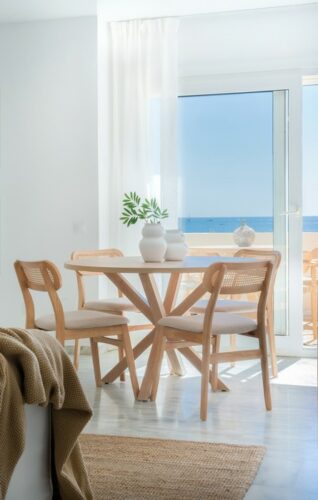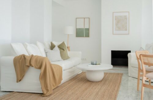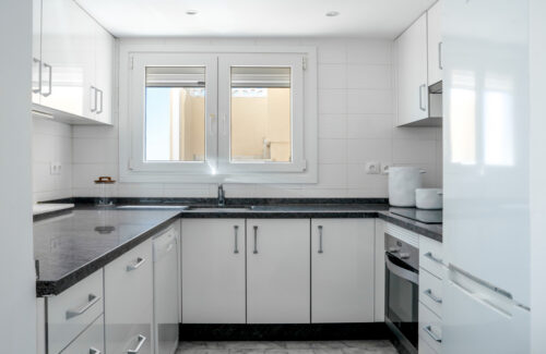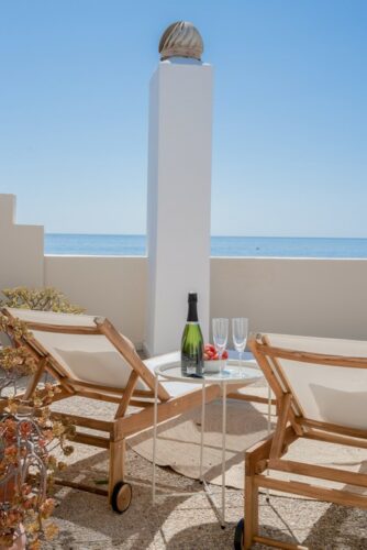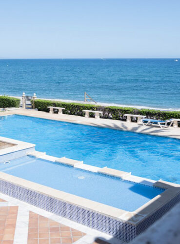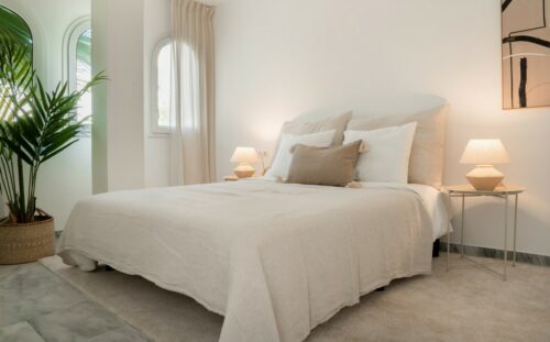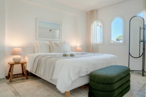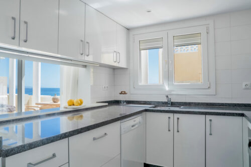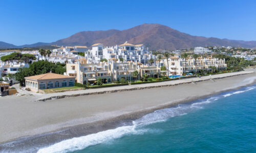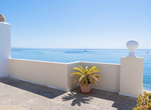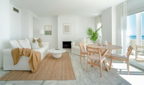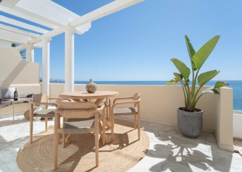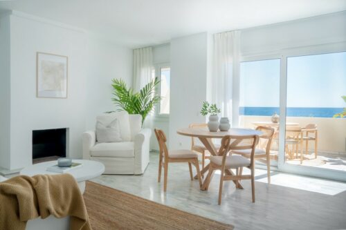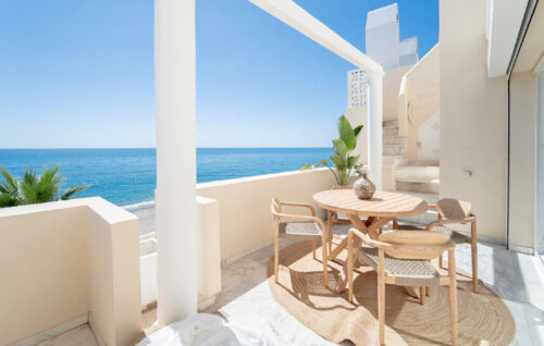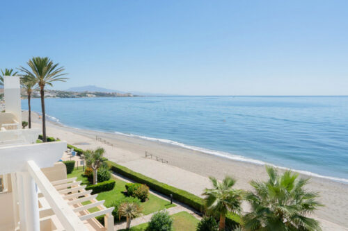 Nyrenoveret strandlejlighed til salg i første linje til fantastisk middelhavsstrand lige udenfor Estepona by, med to store soveværelser, egen tagterrasse og panoramavue over havet.