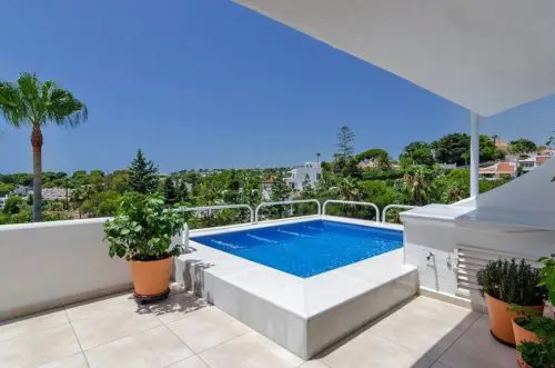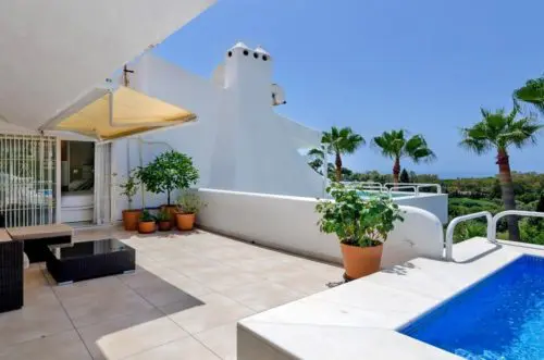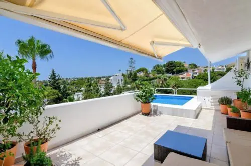 Penthouse lejlighed med egen pool, og smuk Middelhavsudsigt, til salg i herlige Calahonda. Få minutters gang til restauranter, strand, indkøb, golf og bus.
