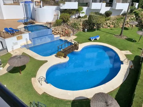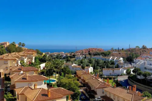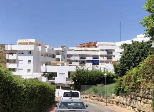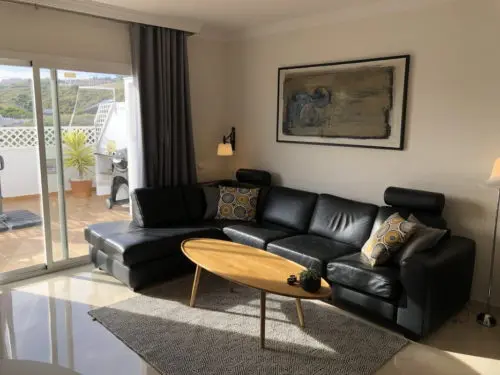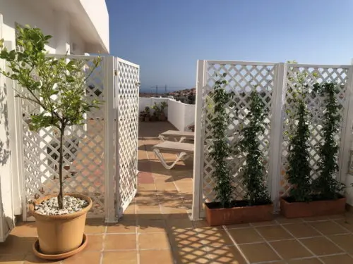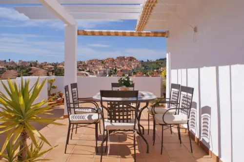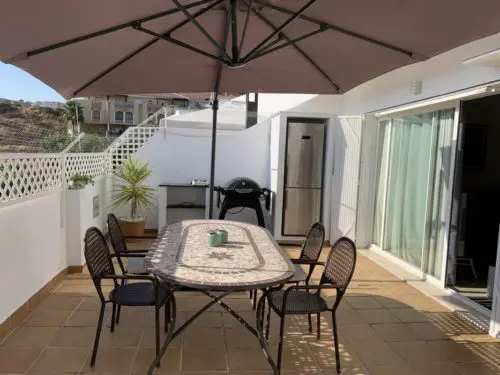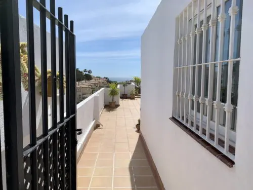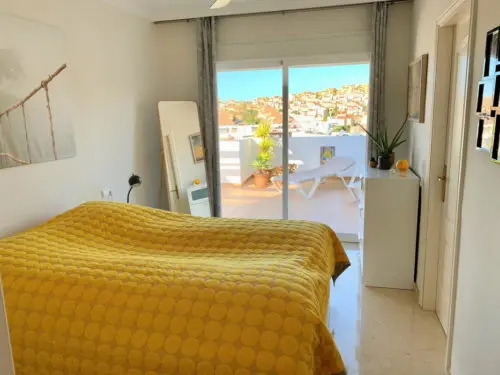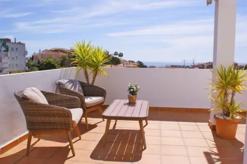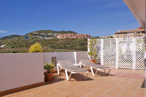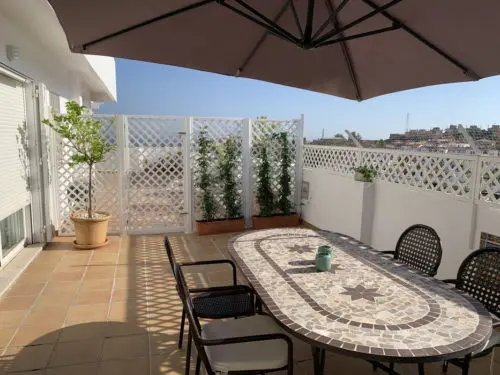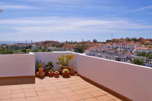 Fantastisk penthouse lejlighed til salg i Rivera del Sol ved Malaga, med kæmpe 130 m² privat terrasse-areal, havudsigt og kort gå-afstand til butikker, restauranter og strand.