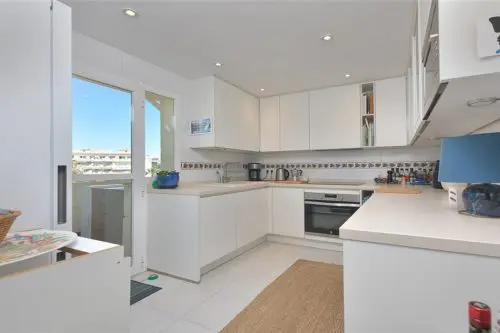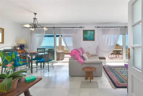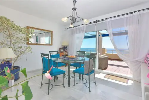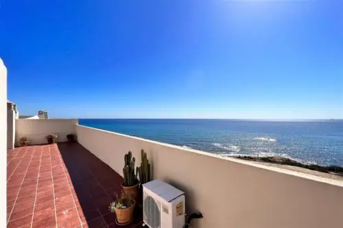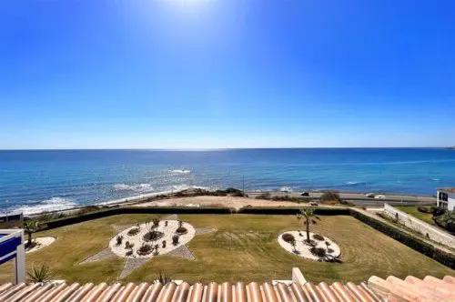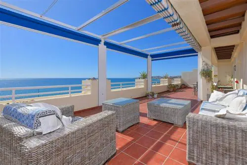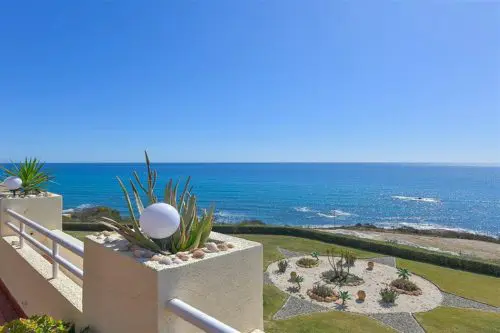 Sjældent udbudt penthouselejlighed med to store private terrasser og panoramaudsigt over vandet, beliggende i første parket til Middelhavet, få minutter fra strand, golf og byliv.