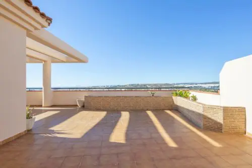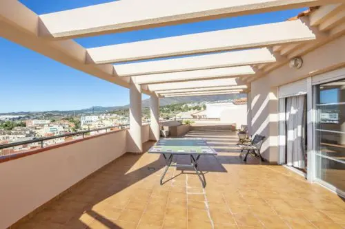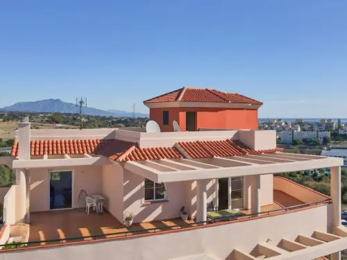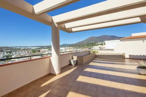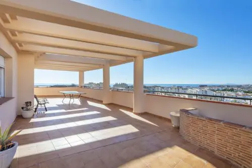 Centralt placeret penthouselejlighed med to soveværelser til salg nær Estepona bymidte, med stor sydvestvendt terrasse, flot åben udsigt og under 1,5 km. gåafstand til stranden.