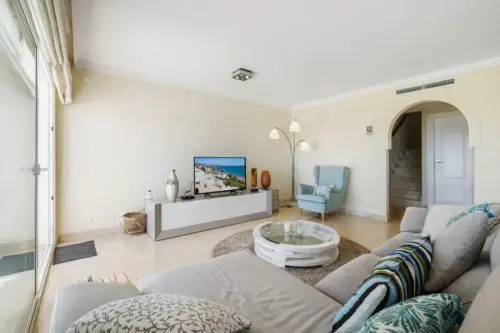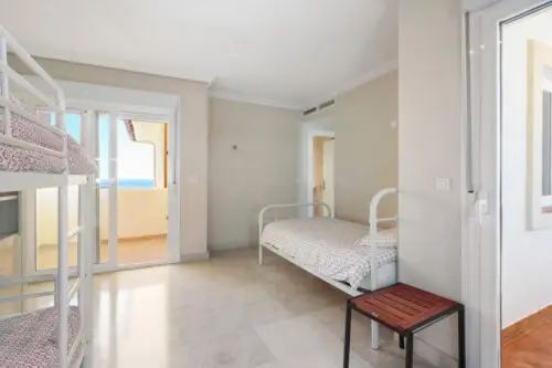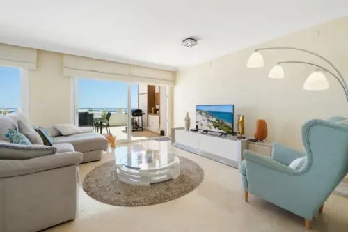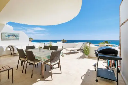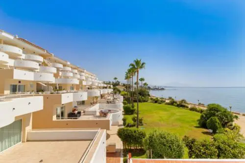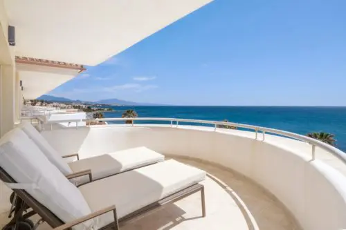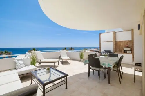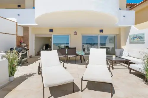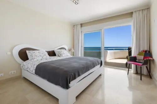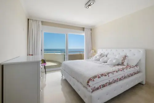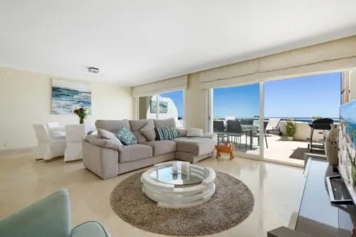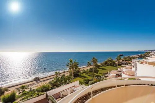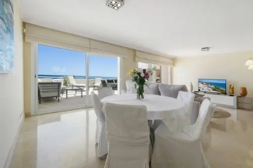 Penthouse til salg i absolut første linje til Middelhavet og stranden i Estepona, med egen stor terrasse, panoramavue og kort afstand til by og golf.
