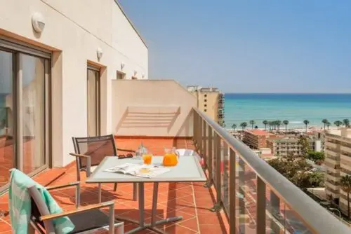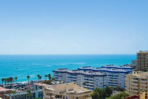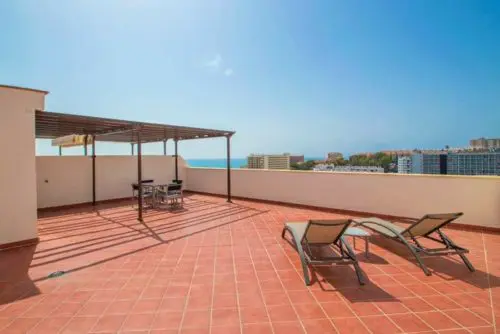 Nyere penthouse med 50m² stor privat tag-terrasse, panoramisk hav- og bjergudsigt samt 2 soveværelser, beliggende kun 200 meter fra stranden i hjertet af Benalmadena til salg.
