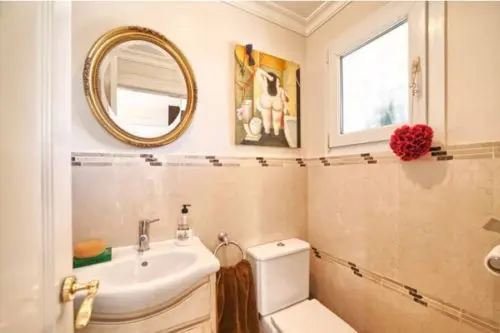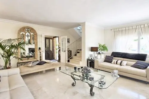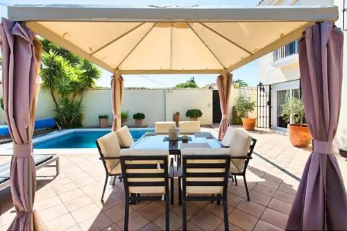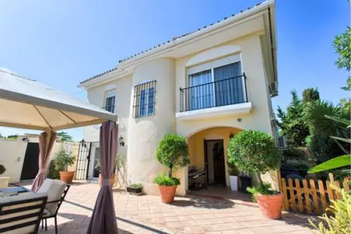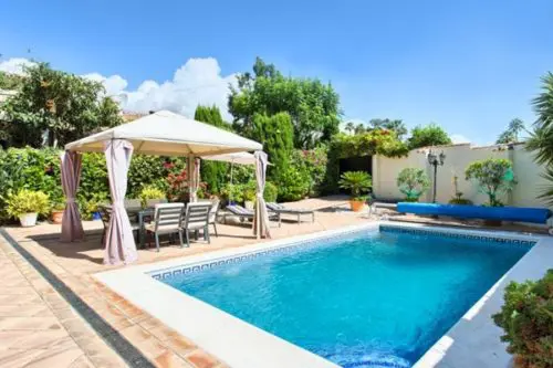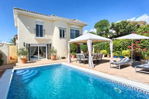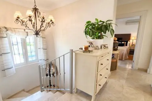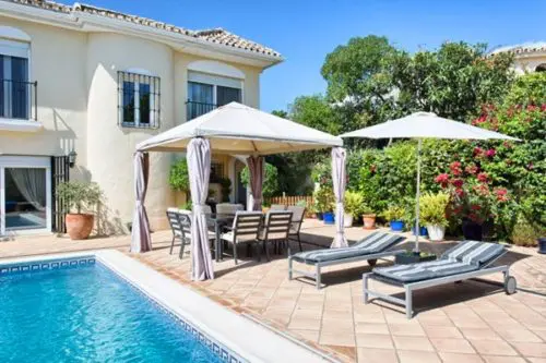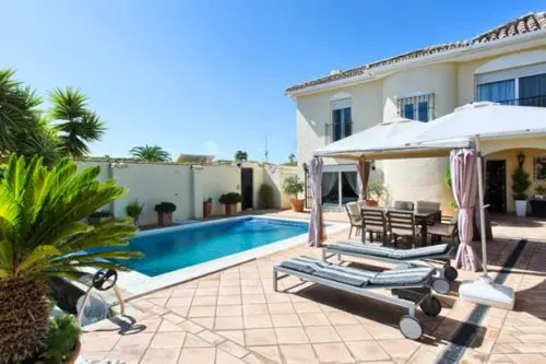 Fantastisk flot og velholdt luksus villa med egen pool til salg nær Estepona by, kun 5 minutters gang fra gode badevenlige strande og lokale restauranter.