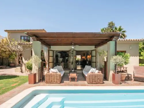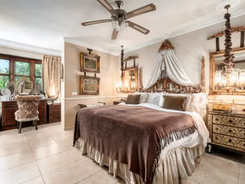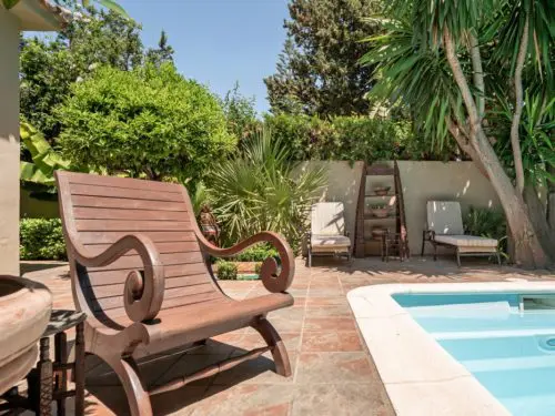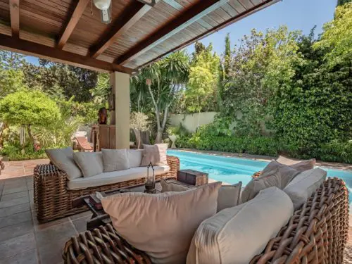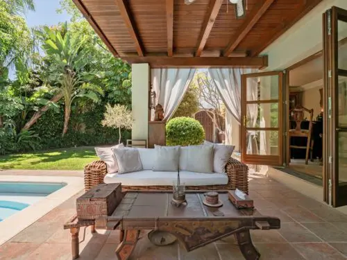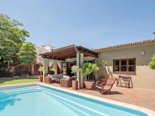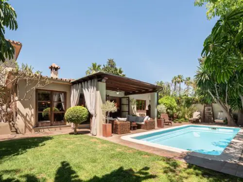 Karakterfuld og smuk middelhavsvilla til salg på attraktiv adresse nær Puerto Banus i Marbella, beliggende kun 800 meter fra strand, og i kort gåafstand til indkøb og spisesteder.