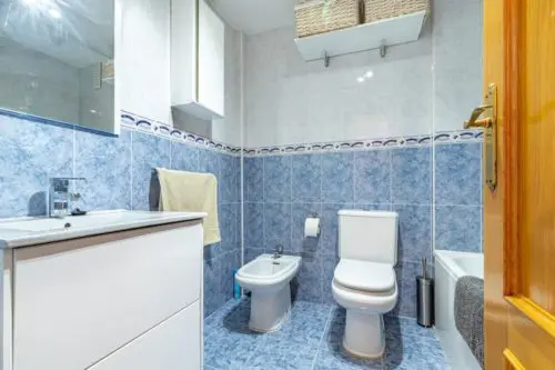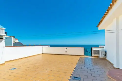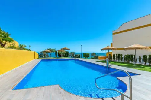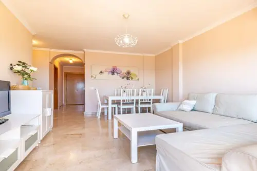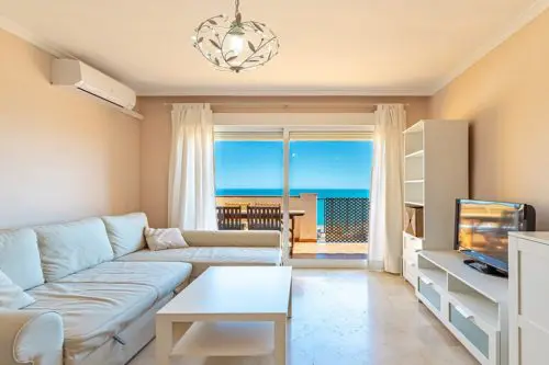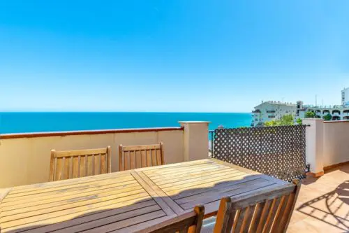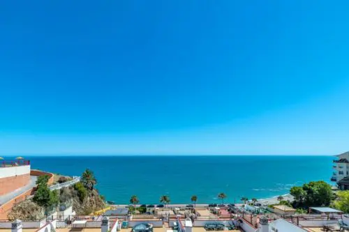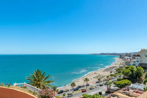 Strandnær ferielejlighed til salg ved Paseoen i Fuengirola, med fantastisk åben udsigt udover Middelhavet og 2 private terrasser med sol fra morgen til aften.
