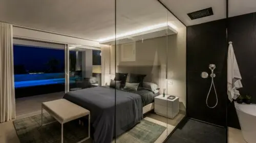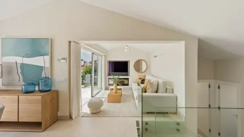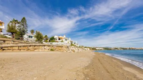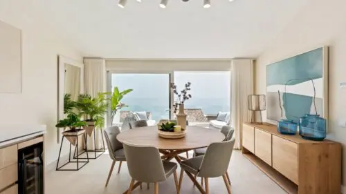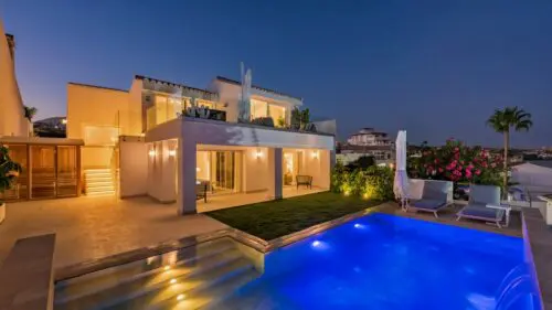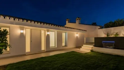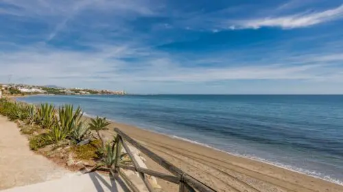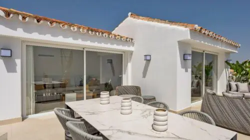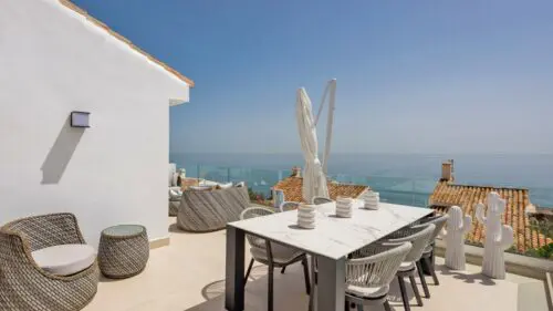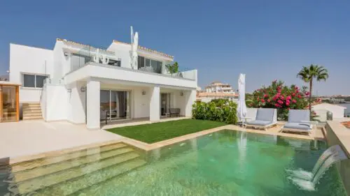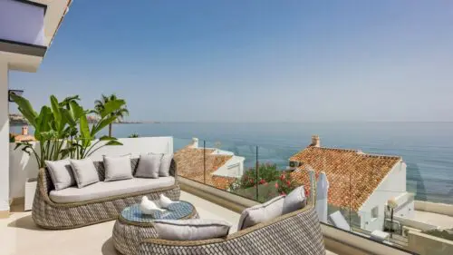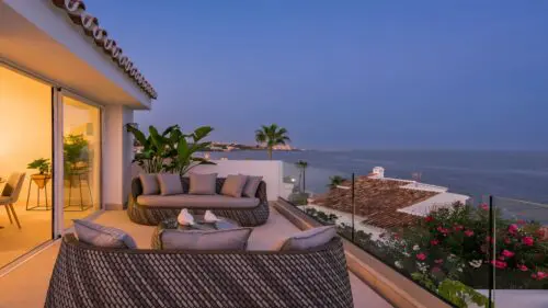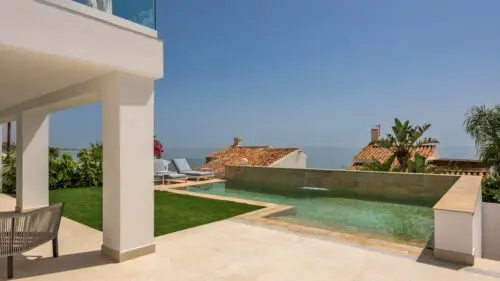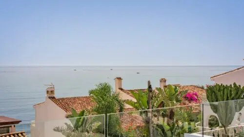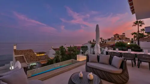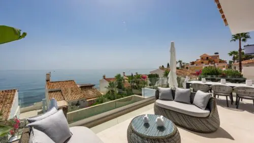 Totalrenoveret strandvejsvilla med fire soveværelser og egen pool, til salg på forhøjet position i anden række til Middelhavet, lige udenfor Estepona by og havn.