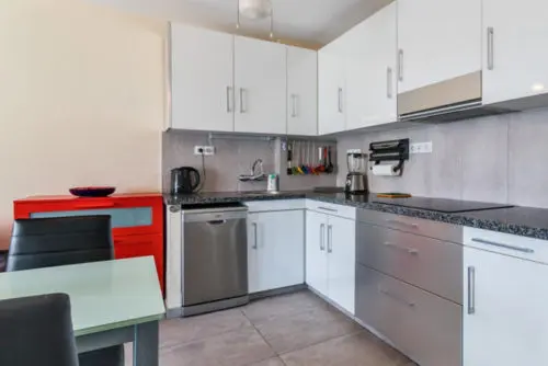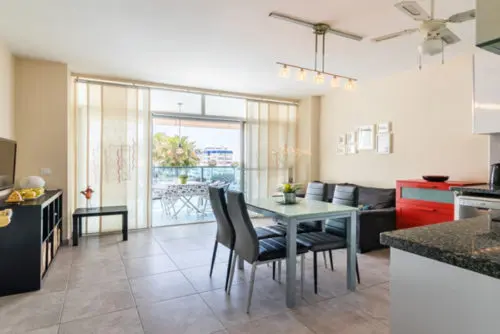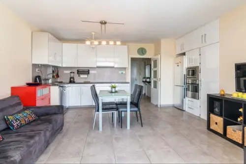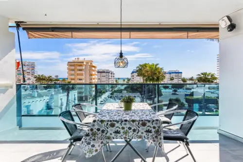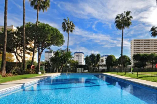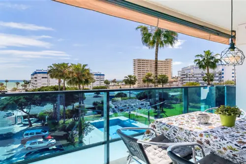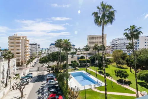 Perfekt placeret ferielejlighed, med dejlig sydvendt terrasse og åben by og havudsigt, beliggende 200 meter fra stranden og promenaden i Benalmadena centrum.