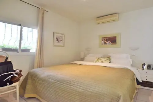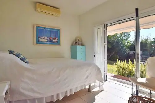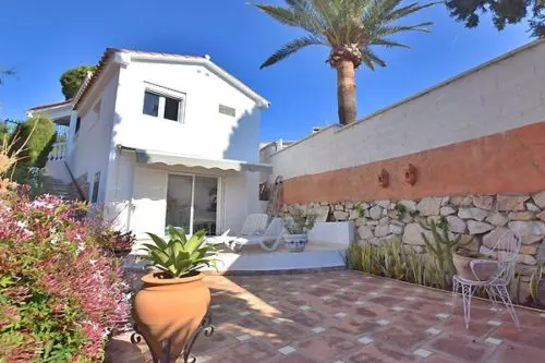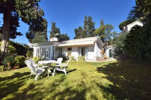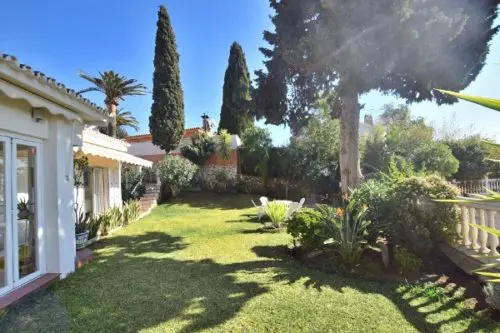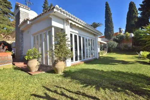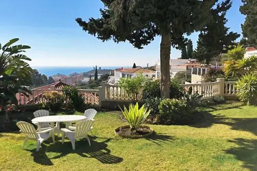 Fantastisk ét-plans villa til salg i Fuengirola, med 3 soverum og smuk havudsigt, beliggende på afskærmet privat grund kun 1 km. fra byens populære strandpromenade.