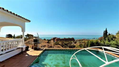 Charmerende spansk villa til salg i Benalmadena, med panoramisk udsigt over Middelhavet, og få minutters gang til stranden. Kun 15. min. kørsel fra lufthavnen i Malaga.